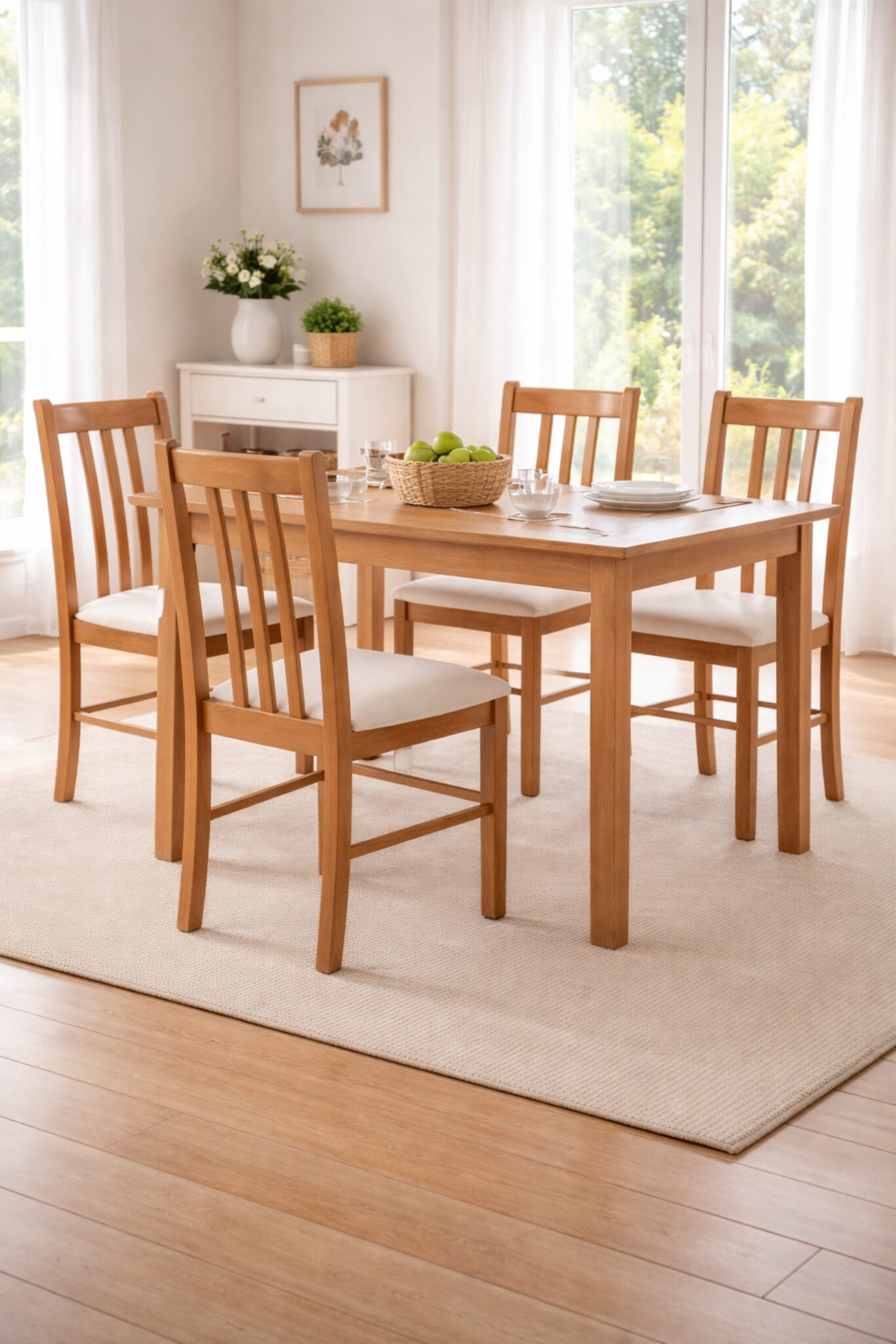 Καρέκλα τραπεζαρίας ή κουζίνας, που συνδυάζει άνεση, ανθεκτικότητα και διαχρονικό στυλ. Κατασκευασμένη από ποιοτικό ξύλο, προσφέρει στιβαρότητα και μεγάλη διάρκεια ζωής, ενώ το μαλακό υφασμάτινο κάθισμα εξασφαλίζει άνεση ακόμα και σε πολύωρη χρήση. Η πλάτη της καρέκλας διαθέτει κάθετες καμπύλες γραμμές που προσδίδουν εργονομία και στήριξη στη μέση, ενώ παράλληλα ενισχύουν τον κλασικό χαρακτήρα του επίπλου. Ο λιτός και κομψός σχεδιασμός την καθιστά ιδανική επιλογή για κάθε χώρο, από παραδοσιακές έως μοντέρνες διακοσμήσεις.