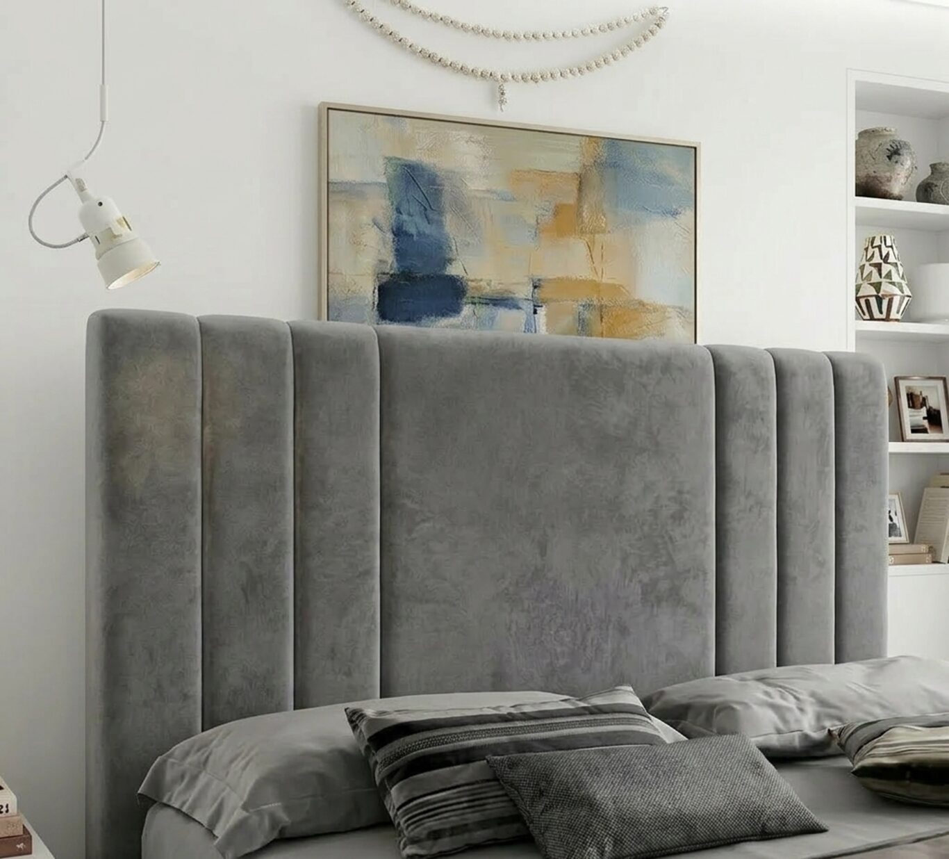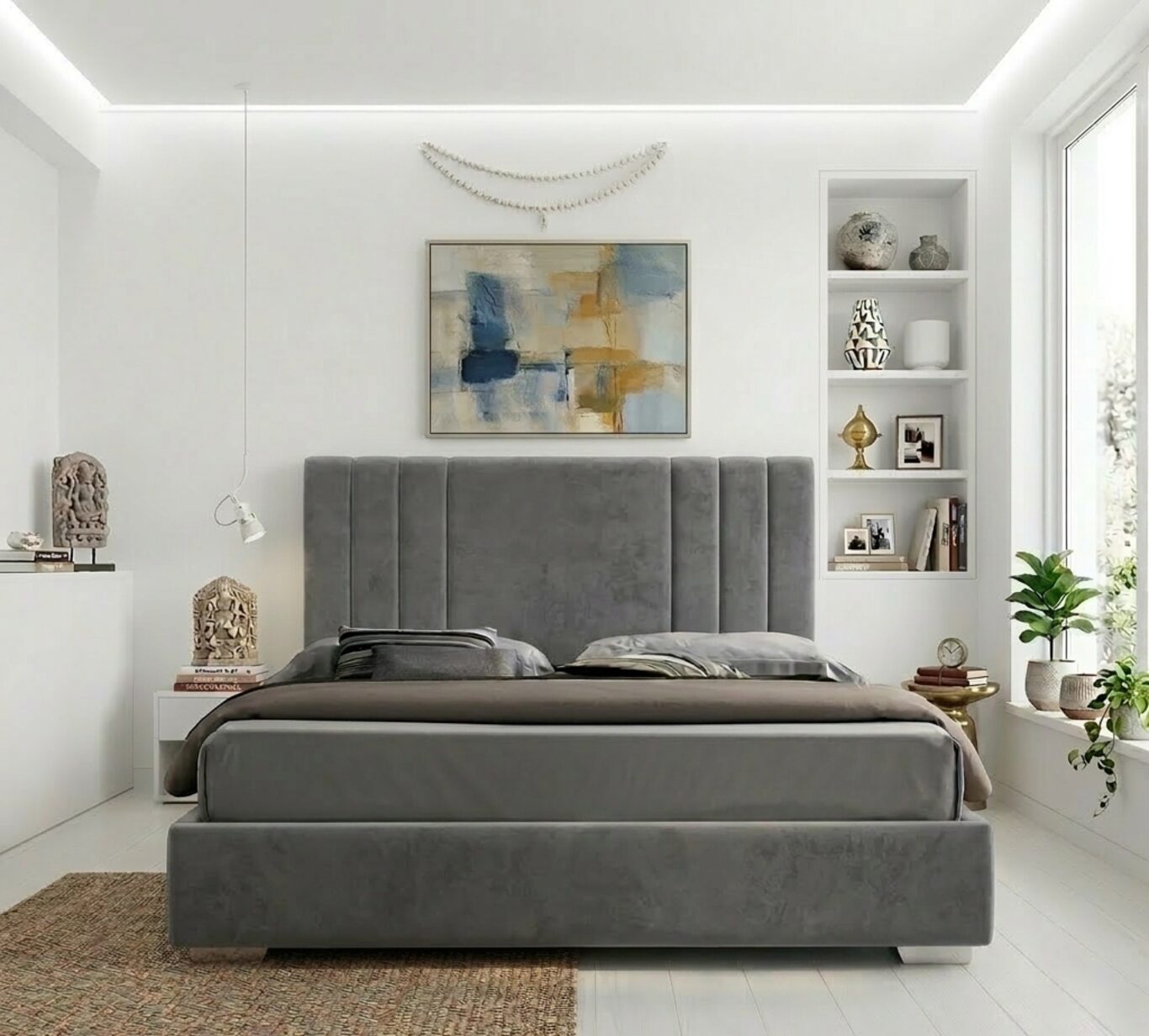 Κομψό κρεβάτι με μοντέρνο σχεδιασμό και επενδυμένο κεφαλάρι, ιδανικό για σύγχρονους χώρους υπνοδωματίου.